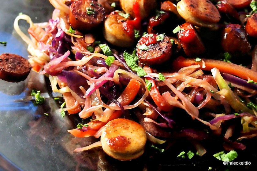 Tänään piti postailla jotain ihan muuta, mutta kun sain taiottua lautaselle tämän savuisen mausteisen kaalipaistoksen kera paistettujen makkarasiivujen, niin totesin, että olisi suorastaan rikollista pantata näin maistuvaa ja helppoa arkiruokaa arkistoissa yhtään pidempään. Tässä on nyt myös kasviksilla höystettyä ÄIJÄRUOKAA parhaimmillaan. Koska mukana makkara ja grilliruoista tuttu savuisuus.