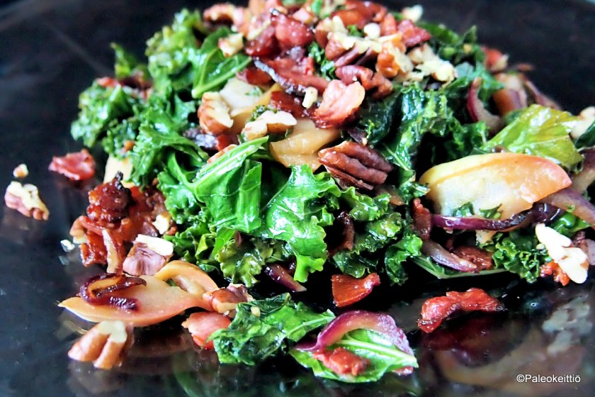 Syksy tuli, salaatit meni! Ei välttämättä, sillä salaattia voi valmistaa aika helposti myös lämpimänä. Tämän syksyisen, lämpimän salaatin pääosassa keikkuu lehtikaali, jota täydentämässä muutama muu ajankohtainen ainesosa.