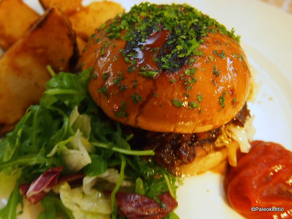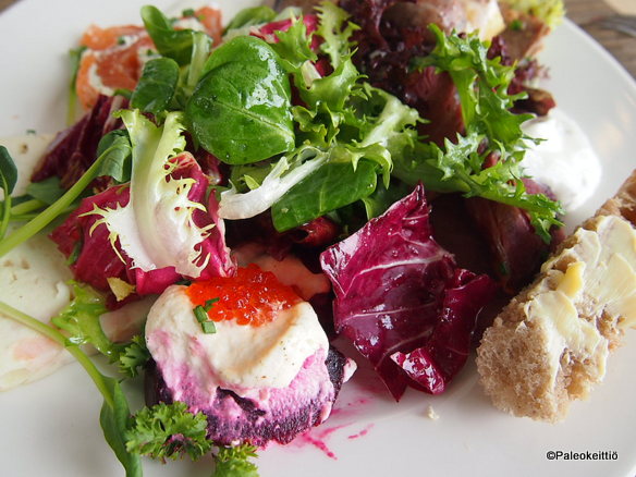 Pääsiäinen vetelee viimeisiään. Eikä siinä mitään, omalla kohdalla kun pyhät sujuivat jokseenkin normiviikonlopun tapaan; pe ja la vähän toimistohommia (ei pitänyt, mut piti sit kuitenkin), sunnuntaina köllöttelyä, riittävästi ruokaa ja juomaa vieraassa pöydässä, tämä päivä siivoillessa ja veroilmoitusta pähkiessä. Pääsiäisen pääruoka oli stroganoff kera maa-artisokkapyreen. Munasaldo pyöreä nolla! Ilman suklaata ei sentään koko pyhä sujunut. Suklaamunat tuli vaan korvattua lahja-Maraboulla; kaakaota 70% ja palat yksittäispakattu. Olihan siinä sitä luksusta riittämiin kääreitä availlessa. Häivähdys joulua. Miksei pääsiäistäkin; täytyy suklaamunatkin kuoria. No mutta, pääsiäisen pääateria tuli nautittua ystävän seurassa paikallisessa gourmet -ravintolassa. Bistro O mat, vanha tuttu ja osaltani paljon kritiikkiäkin saanut. Tällä kertaa ei ruoasta tarvinnut vinkua. Pääsiäsipöytä oli kattava ja kustannuksen arvoinen. Ainoa isompi miinus tuli tunnelmasta. Paikka oli täpösen täynnä; hälyä ja meteliä riitti pienehkössä ravintolasalissa sen verran, että ruoasta nauttiminen oli työn ja tuskan takana. Ei mennyt rauhallinen pääsiäismenu aivan niinkuin ajateltiin vaan pienessä paniikissa ruokaa suuhun lappaessa. Aterian loppupuolella onneksi tilanne hieman rauhoittui, mutta alkuruoat menivät alas jokseenkin sumussa. Ne parhaat. Melkein kaikkea maistoin, mutta vain harvoista muistan, miltä maistui. Alkuruokapöytä tarjoili… …