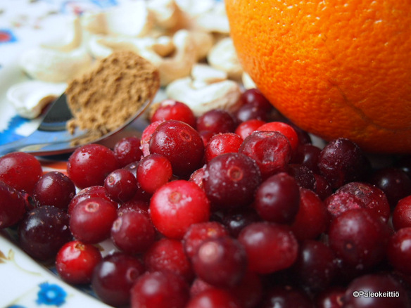 Kyllä, kyllä! Tässä se nyt tulee! Tuo puolikuuluisa joulupirtelö, josta jo ehdin kohkaamaan. Toistaiseksi sitä on saatava joka päivä! Kun aamu alkaa joulupirtelöllä, niin loppupäiväkin menee mukavasti joulumielellä. Kokeile! Varoitus: Saattaa koukuttaa ;) JOULUINEN PIRTELÖ v. 1.0 (~4-5 dl) yksi makea appelsiini (navelinas) pieni kourallinen cashew -pähkinöitä (reilun kaupan luomucashew) ~50 g pakastekarpaloita (biokia) 1/2 tl kanelia (frontier luomuceyloninkaneli) hippunen himalajansuolaa vettä tarpeen mukaan notkistamiseen (raakahunajaa (voi hyvin -luomuhunaja)) (kookoshiutaleita (pirkkaa K-marketista)) Kuori appelsiini. Itse leikkaan tylysti kuoret veitsellä pois, jotta ei tarvitse sen enempää kynsiä appelsiinin kanteen upottaa. Homma hoituu myös nopeammin kuin käsillä väkertäessä. Tehosekoittimen pohjalle ensin hieman vettä, jotta ei tarvitse ihmetellä mistä se savu nousee. Perään kuoritun appelsiinin palaset, pähkinät, jäiset karpalot, kanelit ja muut mausteet, ja tehovekoitin päälle. Pähkinät tuovat pirtelöön kivasti kermaisuutta. Hunajaa voi lisätä tarvittaessa. Riippuu hieman appelsiinin makeusasteesta. Vaikka kuvissa kookoshiutaleet ovat laskeutuneet nätisti lumen lailla pirtelön pinnalle, niin arkipirtelössä heitän hiutaleet tylysti sekoittimeen. Viimeiseksi. Ja muutamat pyöräytykset riittävät, koska pidän pureskeltavista pirtelöistä. Noh, tässä tapauksessa ainakin. Vihreät vedetään silkkisen sileiksi. Tai niin sileiksi kuin vanha monitoimi-Moulinex …