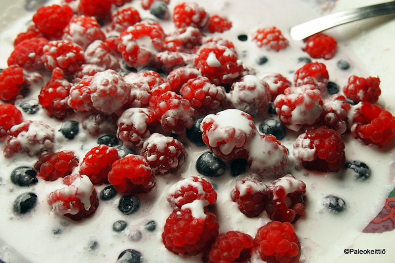 Tuoreet marjat alkavat olla menneen kesän hedelmiä. On vähitellen aika siirtyä korjatun sadon pariin. Onneksi pakastimessa riittää metsämarjaa. Toivottavasti ensi kesään saakka. Kookoskefiiri ja tuoreet marjat ovat melko voittamaton yhdistelmä. Mutta eipä tämä pakastevadelmista valmistettu vaaleanpunainen viettelys paljoa tuoreelle kesäserkulle häviä! Sopii kauhoa vanukkaana kulhosta lusikalla tai kulauttaa pirtelönä kurkkuun lasista. Avain asiaan löytyy nesteen määrästä tai chia -hyytelön jämäkkyydestä ;)