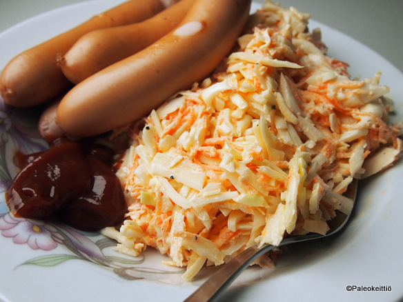 Siinä se taas on! Viime viikon teemaruoka ja muutenkin vanha, tuttu juttu. Kaaliraastesalaatti! Paljoakaan ei ole simppeli resepti vuosien varrella muuttunut, mutta kyllähän hyvästä kannattaa aina silloin tällöin muistutella ;) Coleslaw`n kastike vuosimallia 2013 1 prk smetanaa ~1 dl luomumajoneesia (Kavli) 3-4 rkl valkoista viinietikkaa 1 iso tl Dijon -sinappia luraus luomuhunajaa (Voi hyvin!) rouhittua mustapippuria 1 isohko tl himalajan suolaa Kastikeainekset sekaisin ja tekeytymään raastinvaiheen ajaksi. Luomuporkkana raastettuna ~300-400 g.     Mukaan valkokaalia raastettuna vaihtelevasti jotain 600 ja 900 gramman väliltä, ja homma sekaisin. Kastikkeet messiin, sekaisin, jääkaappiin tekeytymään ja viikon lisukkeet ovat valmiit. Kuvissa neljän litran astia ja reippaasti yli kilon valmista tavaraa, josta riitti yhdelle ihmiselle neljän tai viiden aterian täytteeksi. Ja niinhän sitä sitten kaaliraastesalaattia nautittiin päivä toisensa jälkeen… …keitettyjen luomunakkien ja viinietikka-Heinzin kanssa. …paistettujen kalkkunan rintafileiden kaverina. Jotka ehdin jo pieniä suunmentäviksi ennen kuin muistin kaivaa kameran esiin. Kuvassa puolitoista ohutleikettä suolalla ja sitruunapippurilla maustettuna. …ja jauhemaksapihvien ja puolukkahillon kylkiäisenä. Sama juttu, mutta uusi ateria joka päivä. Melkein. Oliko tämä syöminen vielä jonkun mielestä vaikeaa? ;)