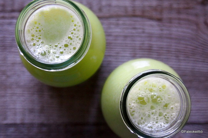 Kesän kääntyessä lempeästi syksyyn teki mieli kaivaa taas Jamie tauolta. Jo muutaman viikon ajan olen viettänyt kerran viikossa mehustuspäivää. Reilu litra tulee paria eri sorttia kerralla puristettua. Vihdoin olen onnistunut tuunaamaan myös kitkeristä kaalimehuista juotavia. Salaisuus piilee tuoreessa kaalissa. Ja sitruunassa. Myös liika kaali tekee juomasta vaikeammin nieltävää. Laimentavina elementteinä toimivat mainiosti Äipän kasvimaalta ”pöllityt” avomaankurkut. Tuoreet. Nekin kun tahtovat aika pikaseen jääkaapissa kitkeröityä.