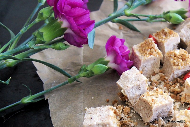 Kuten Paleokeittiön facebook -seuraajat tietävät, niin olen tässä kevään mittaan yrittänyt kertaan, jos toiseenkin, taikoa jonkinlaista paleoystävällistä toffeeta. Siinä varsinaisesti onnistumatta. Kokeilujen tuloksena olen kuitenkin onnistunut keittelemään jokseenkin täydellistä kinuskia (joka vielä odottaa sitä kakkua =D) sekä tätä helppoa herkkua, joka mielestäni muistuttaa lähinnä valkoista suklaata. Ja nimenomaan mun mielestä! Pullamössökansalta ei juurikaan herunut tukea ajatukselle =D Mikä tyypeissä on vikana?! Ehkä vika katsoo peilistä ;) VALKOINEN PALEOSUKLAA 1 dl kookosvoita (coconut butter, on siis eri asia kuin kookosöljy) 1/2 dl mantelivoita 1/2 tl aitovaniljajauhetta (1-2 rkl raakahunajaa) Sekoita kaikki ainekset hyvin keskenään. Lämmitä tarvittaessa kookosvoi juoksevaksi ennen sekoitusta. Kaada seos esim. leivinpaperilla vuorattuun, pienehköön astiaan. Anna jähmettyä jääkaapissa, paloittele ja napostele. Säilytä jääkaapissa, tiiviisti suljetussa astiassa. Jos kotoa olisi löytynyt cashew -voita, niin olisin ehdottomasti käyttänyt sitä. Tällä kertaa tyytyminen oli kuitenkin mantelivoihin. Ihan hyvä näinkin, mutta koostumus olisi todennäköisesti ollut silkkisempää cashew -voilla. Mutta mikä tahansa pähkinä- tai siemenvoi toiminee… Musta kookosvoi on jo itsessään riittävän makeaa, joten en lisännyt ”suklaamassaan” mitään varsinaista makeuttajaa. Sen sijaan ideana oli päällystää ”suklaapalat” mulperirouheella siinä vaiheessa, kun lähdin kiikuttamaan …