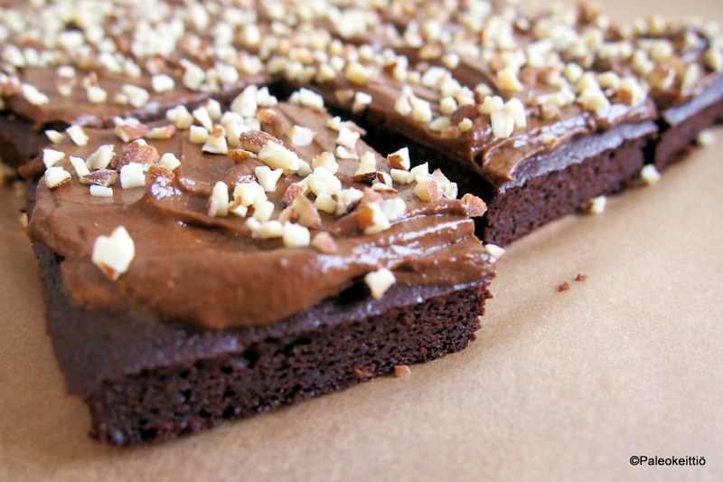 EDIT 30.11.15: Tsekkaa myös uudet, suklaakuorrutteella ja paleomurulla päällystetyt bataattibrowniet! Edellisviikonloppuna otin ja leipaisin pienet paleobrowniet. Niistä tuli hyviä. Parhaimpia. Parhaimpia, joita olen koskaan maistanut. Saati sitten omin kätösin leiponut. Koska kumpaakaan en ole aiemmin tehnyt, en sen enempään leiponut kuin maistanutkaan paleobrownieta. Mutta olen onnellinen, että se päivä koitti! Koska nämä olivat niiiiiiin hyviä! Syvästi suklaisia, kivan kosteita, mutta silti ihanan ilmavia. Jopa kevyitä, sanoisin. En ole missään tapauksessa mikään jauhopeukalo. Mitä leipomiseen tulee, niin olen lähinnä poropeukalo. Tai niin olen aina kuvitellut olevani. Koska en ole oikein koskaan leiponut mitään. Paitsi viimeisen vuoden aikana olen leiponut enemmän kuin neljänäkymmenenä edellisenä yhteensä. Kokonaiset viisi kertaa. Paleobrowniet mukaan lukien. Mielestäni olen jopa onnistunut aivan kohtalaisesti. Muut saattavat, voivat ja saavat olla eri mieltä. Vehnäjauhoja ja sokeria en osaa vieläkään käyttää. Paitsi kerran eksyessäni macaron -maahan. Oh boy, silloin ei sokerilta voinut välttyä. Vehnältä sentään kyllä. Tämä leipomusinto iski aivan yht`äkkiä ja yllättäin. IHerbin fb -streamissä tuli eksoottinen brownien ohje vastaan. Ja koska olen suklaan suurin ystävä, en voinut ohittaa reseptiä pelkällä olankohautuksella. Kokeiltava oli! Näillä peukaloilla. Pohjan ohjeesta …